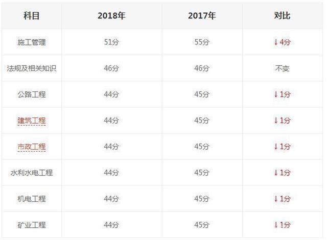四川18年二建各科合格线相比17年来说,公共科施工管理下降4分,专业科均下降1分。